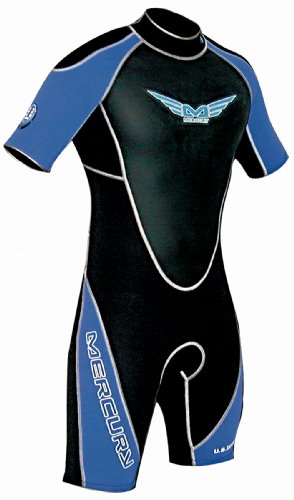 This U.S. Divers' Mercury wetsuit--made of the highest-quality materials available--offers a superior combination of fit, performance, and style. The "shorty" suit is distinguished by its short-sleeve arms and legs and its titanium-blend 3 mm chest panels, which reflect heat back to the body to keep divers and surfers warm in cool currents. The suit also features 2 mm side panels and super-stretch panels under the arms, both of which give the wearer added flexibility whether twisting to the side or reaching upward. And thanks to the neoskin seals on the neck, legs, and wrists, the suit seals out water with aplomb. Other details include flat-lock stitching for extra comfort, a heavy-duty corrosion-free #10 YKK zipper on the back, and a pull chord with a double-tap hook and loop tie down to keep the suit fully sealed. The Mercury shorty suit is backed by a two-year limited warranty.